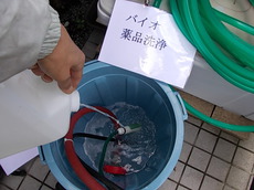 | バイオ洗浄液を作ります。 | バイオの力で汚れを根こそぎ落とします。 | 外壁の汚れをしっかり落とします。 |