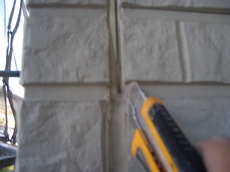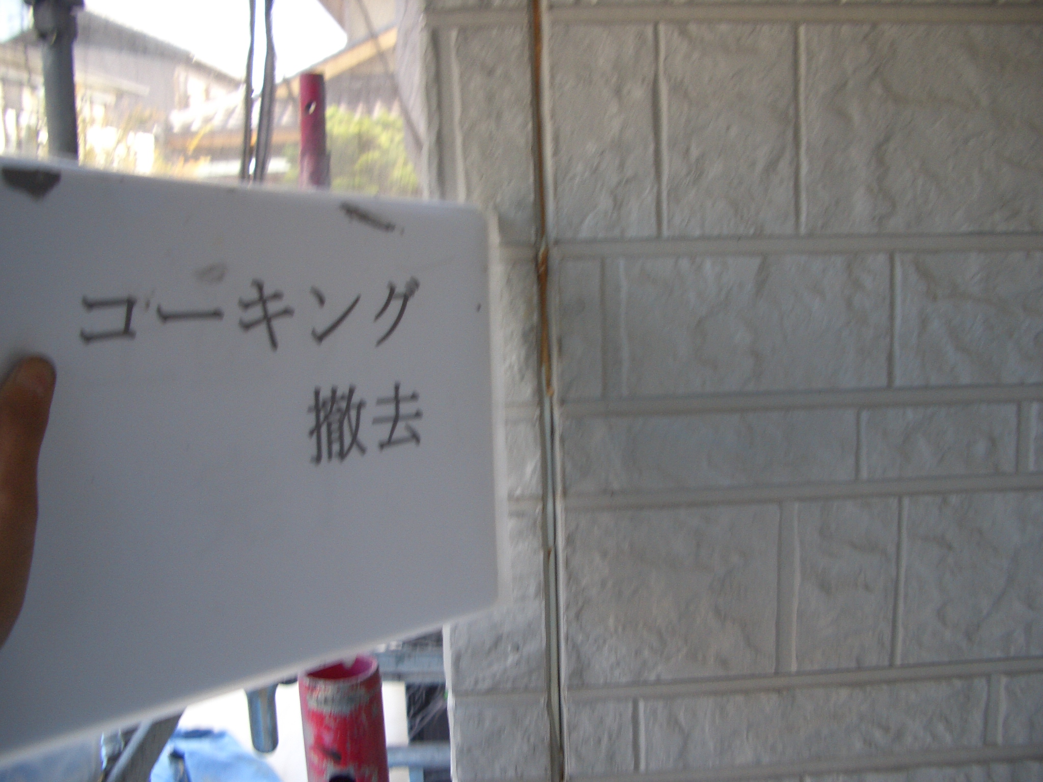| 古くなったコーキングを取り除きます。 | カッターを使って取り除いていきます。 | 養生(青いテープ)をしてプライマー(接着剤)を塗ります。 |