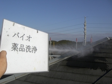 | バイオ洗浄液を作ります。 | バイオの力で汚れを根こそぎ落とします。 | 屋根の汚れやコケをしっかり落とします。 |