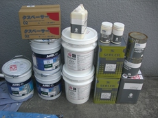 | 屋根用の塗料「ガイナ」と外壁用の塗料「アステックペイント」です。 | 屋根下塗り(1回目)です。 | 屋根下塗装(1回目)完了。 |